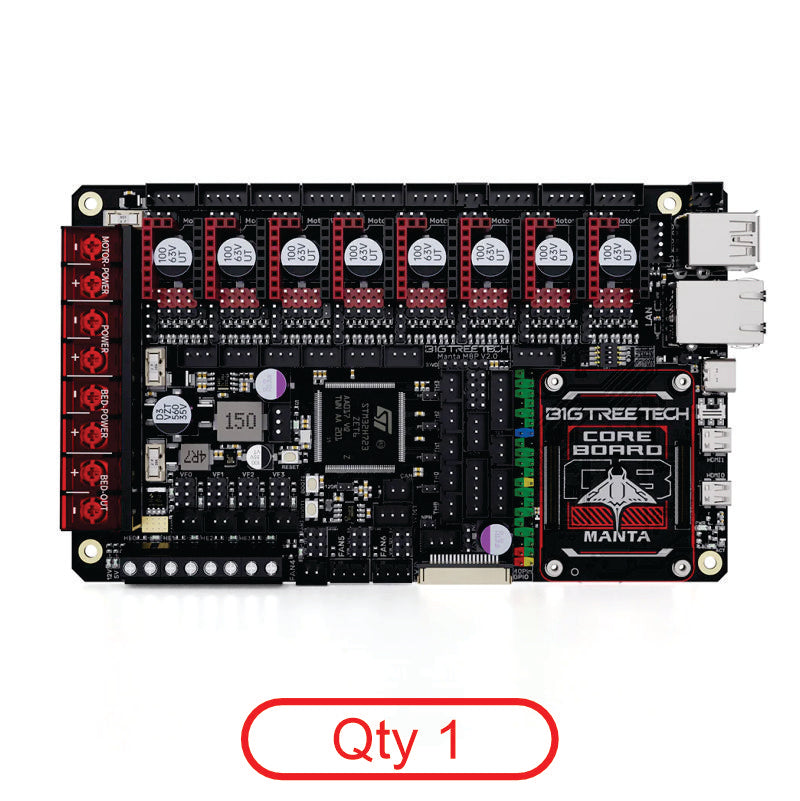 BIGTREETECH Manta M8P V2.0 Integrated Control Board  Manta series of Boards provides an all-in-one solution capable of using Raspberry pi Compute modules or BTT CB1/CB2 solution to simplify the electronics box. This particular board features 8 driver slots with faster 550mhz processor and HV driver capability up to 60v Specs:...